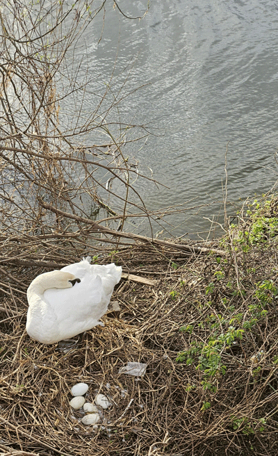 The swan is in its usual nest on the riverbank.